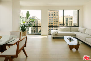 Located in the sought-after Historic Core district of Downtown LA, this meticulously reimagined residence at The Rowan is a rare offering that artfully blends timeless architecture with modern sophistication. Inside, soaring 12-foot ceilings and expansive floor-to-ceiling windows flood the space with natural light, highlighting the stunning solid white oak chevron flooring, setting the tone for its sleek, minimalist aesthetic. The open-concept living area flows seamlessly into a chef's kitchen, complete with a waterfall quartzite island, premium stainless steel Bertazzoni appliances, a Sub-Zero refrigerator and wine fridge, and bespoke cabinetry throughout. Thoughtfully designed, the home features a true one-bedroom layout with generous wall space - ideal for art collectors and design enthusiasts. Clean, refined details include trimless flush Bocci outlets, discreet air vents, and two custom walk-in closets that blend seamlessly into the walls. One of the home's most desirable features is its rare, oversized private patio - perfect for relaxing or entertaining in style. As a resident of The Rowan, you'll enjoy access to a suite of premium amenities: 24-hour front desk and reception, resident lounge with event space and Wi-Fi, hot and cold plunge pools, outdoor BBQ and dining areas, a private dog run, and exceptional property tax savings under the Mills Act program. Parking and extra storage are also available for rent. Situated in the heart of Downtown LA, The Rowan offers unmatched access to the city's top dining, shopping, entertainment, and cultural landmarks. From nearby art galleries and trendy boutiques to the vibrant pulse of downtown living, this is a lifestyle opportunity unlike any other.